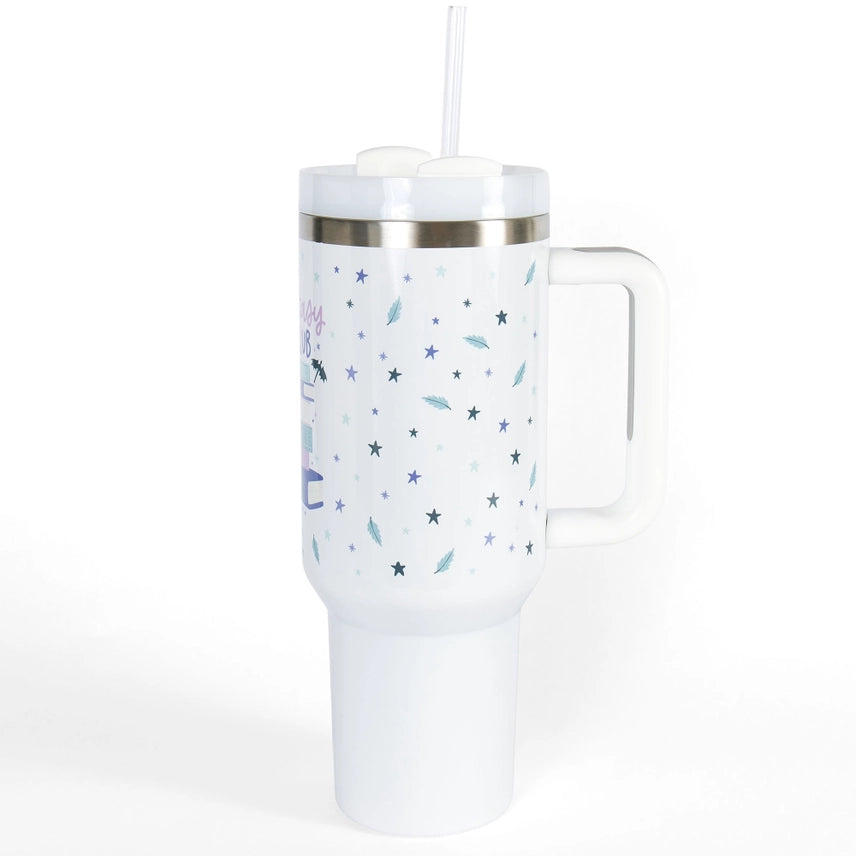 Welcome to the Romantasy Book Club—hydration is mandatory, dragons optional. This 40oz Tumbler is made for deep-diving into magical worlds, annotating your latest slow burn, and surviving all the fictional betrayals along the way. Featuring a dreamy stack of books, fluttering feathers, and swooping dragons, it’s giving fae-core meets reader-core. With a comfy handle, leak-resistant lid, and space for allll the ice, this tumbler is your new favorite reading buddy. Perfect for fantasy lovers, book club girlies, and anyone whose emotional support beverage is as big as their TBR.